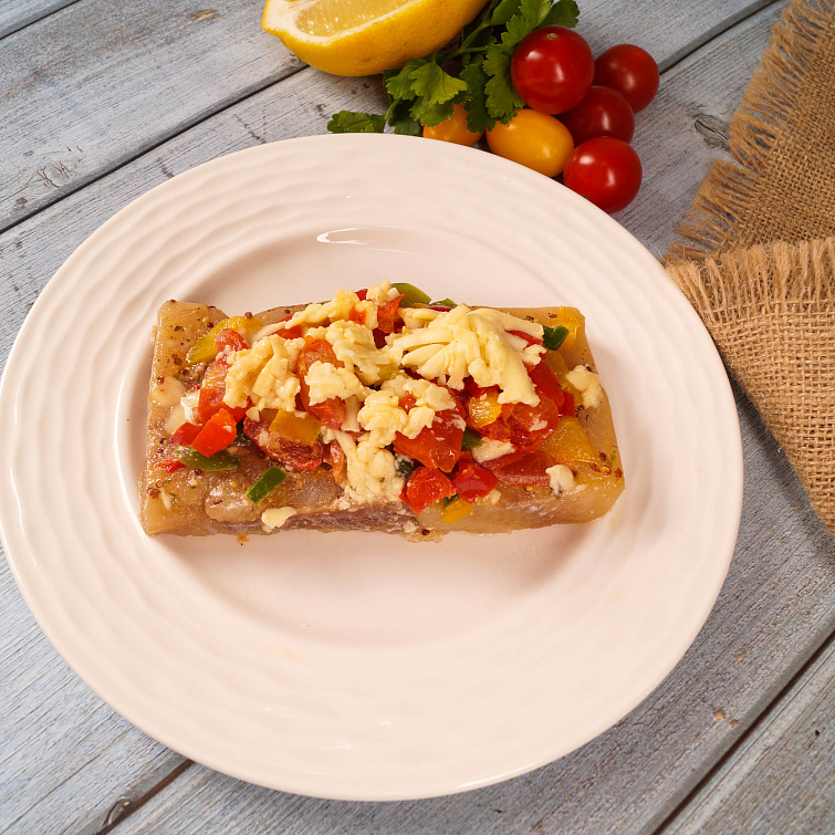 Откройте для себя изысканное сочетание нежного филе минтая под аппетитной овощной шубой! Свежие кусочки минтая сопровождаются яркими болгарским перцем и сочными помидорами черри, а сверху щедро покрыты сливочным сыром и мягким майонезом с нотками устричного соуса. Домашняя гармония вкусов и свежести делает это блюдо идеальным выбором для легкого, но насыщенного обеда или ужина. Насладитесь вкусом морских деликатесов и ярких овощных оттенков в каждом кусочке!