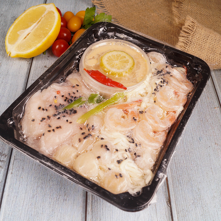 Кальмар, креветка тигровая, гребешок, лапша удон, бульон куриный, соль, сахар, молоко кокосовое, молоко, масло кунжутное, паста том-кха
