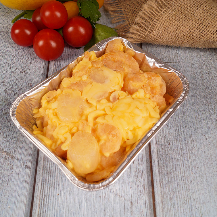 Гребешок, креветка, соус Чеддер, сыр тертый голландский