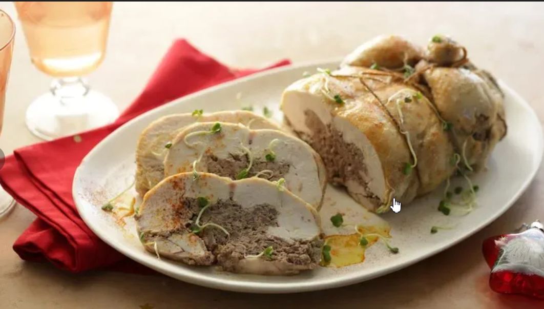 - Порей крупно нарежьте и промойте. Выложите порей в противень, на него – фаршированную курицу. Запекайте в разогретой до 180 °С духовке примерно 40 мин., периодически поливая образующимся соком. Затем остудите, нарежьте на порционные куски.