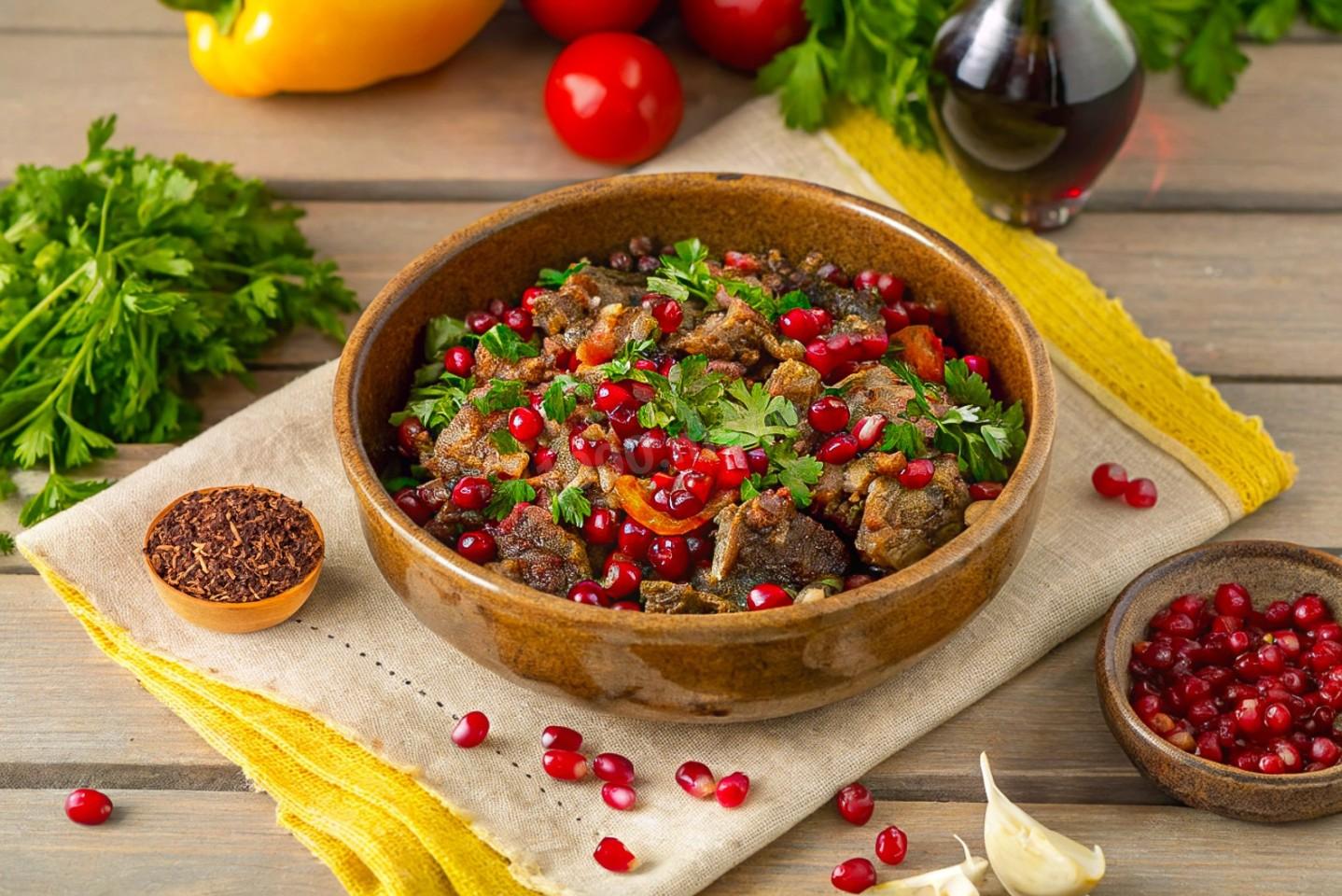 - Готовое блюдо снимаем с огня, плотно накрывая крышкой и дают настояться. Тем временем мелко рубим кинзу и очищают гранат — желательно охлажденный, выдержанный в холодильнике не меньше двух часов, тогда зернышки будут приятно играть на контрасте.