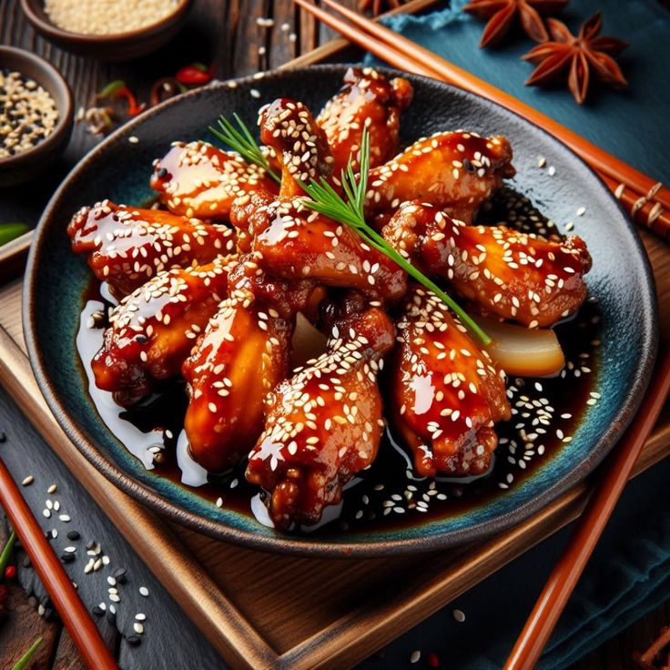 - Готовые крылья переложите на сервировочное блюдо. При помощи кисточки смажьте их оставшимся соусом терияки, чтобы они блестели, посыпьте кунжутом и нарезанным зеленым луком. Подавайте немедленно.