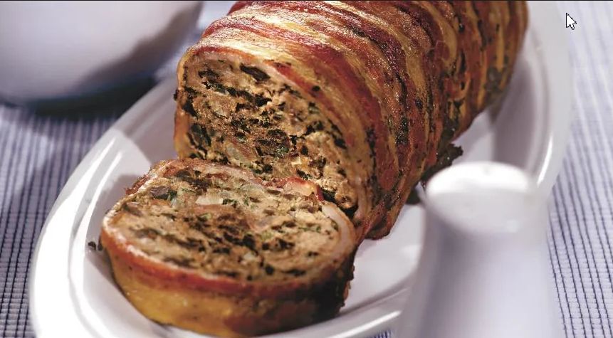 - Прямоугольную форму для запекания с высокими бортиками выстлать полосками свиной грудинки так, чтобы были закрыты дно и борта, а концы полосок свешивались наружу.