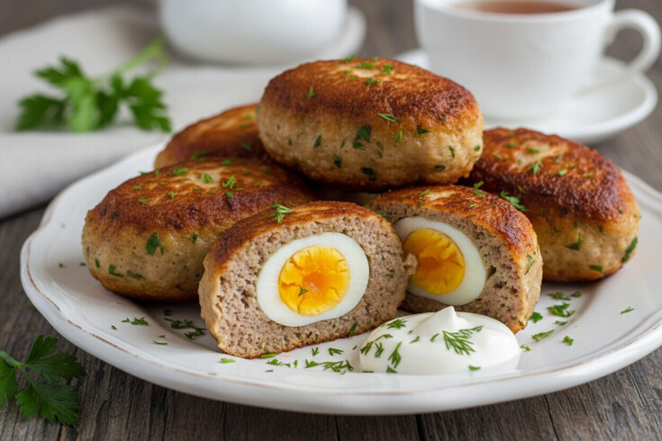 - Слепить из мясного фарша 4 лепешки. В центр каждой положить по одному вареному яйцу.