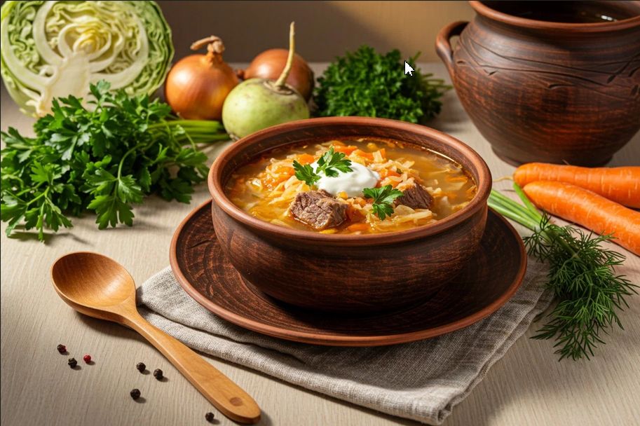 - Увеличить температуру духовки до 190 °С. В горшочки с капустой добавить мясо, картофель с грибами, луково-морковную заправку, коренья и репу. Сверху положить чеснок и зелень. Влить в горшочки бульон, накрыть. Поставить в духовку на 25–30 мин.
