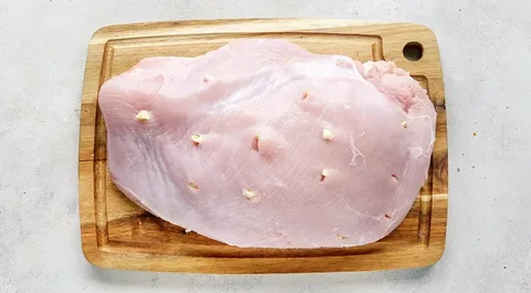 - Делаем небольшие углубления в мясе, вставляем очищенные зубчики чеснока внутрь.