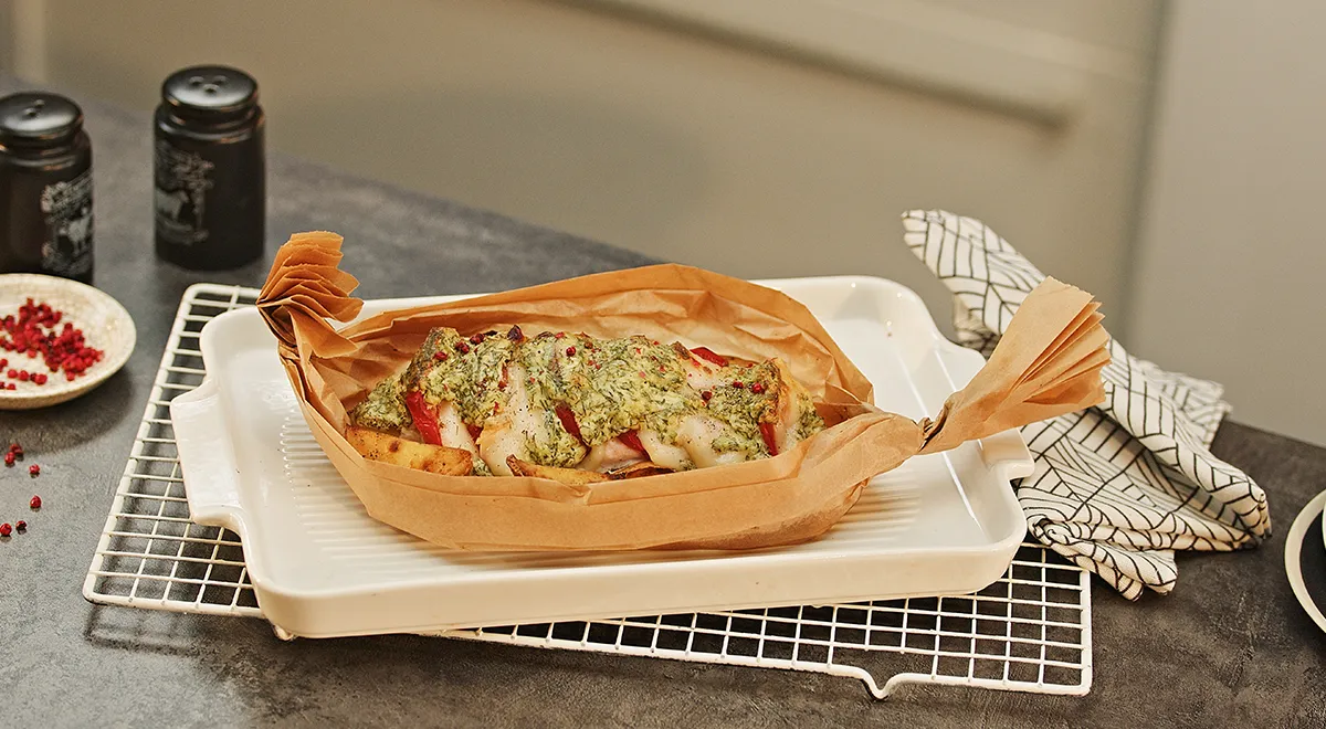 - Переложите конверт с филе на противень и запекайте в разогретой духовке 30 минут.