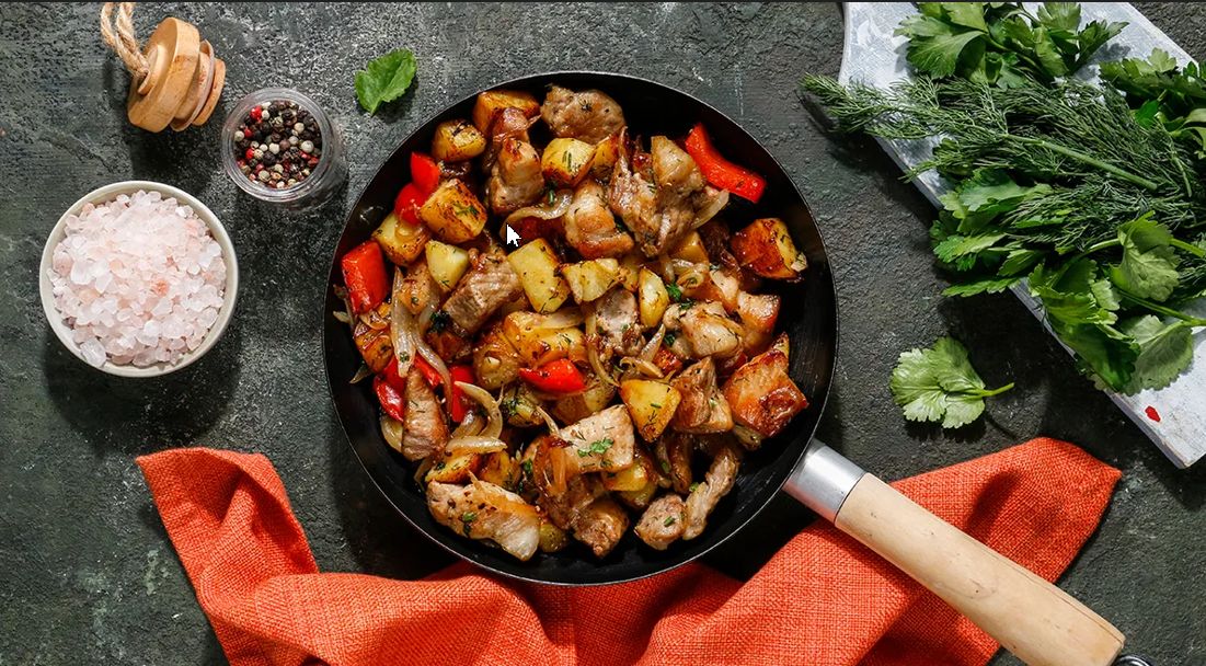 - Подготовьте необходимые ингредиенты для горячей сковородки. Свинину нарежьте небольшими кубиками — с ребром не более 2 см. Тщательно вымойте и очистите картофель.