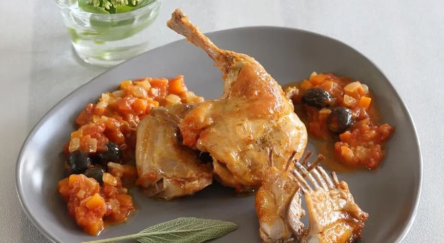 - Лук, чеснок и морковь очистить и нарезать кубиками. Добавить в сковороду с обжаренными кусками кролика, перемешать. Добавить помидоры, маслины, шалфей, влить вино. Тушить 40-50 мин.