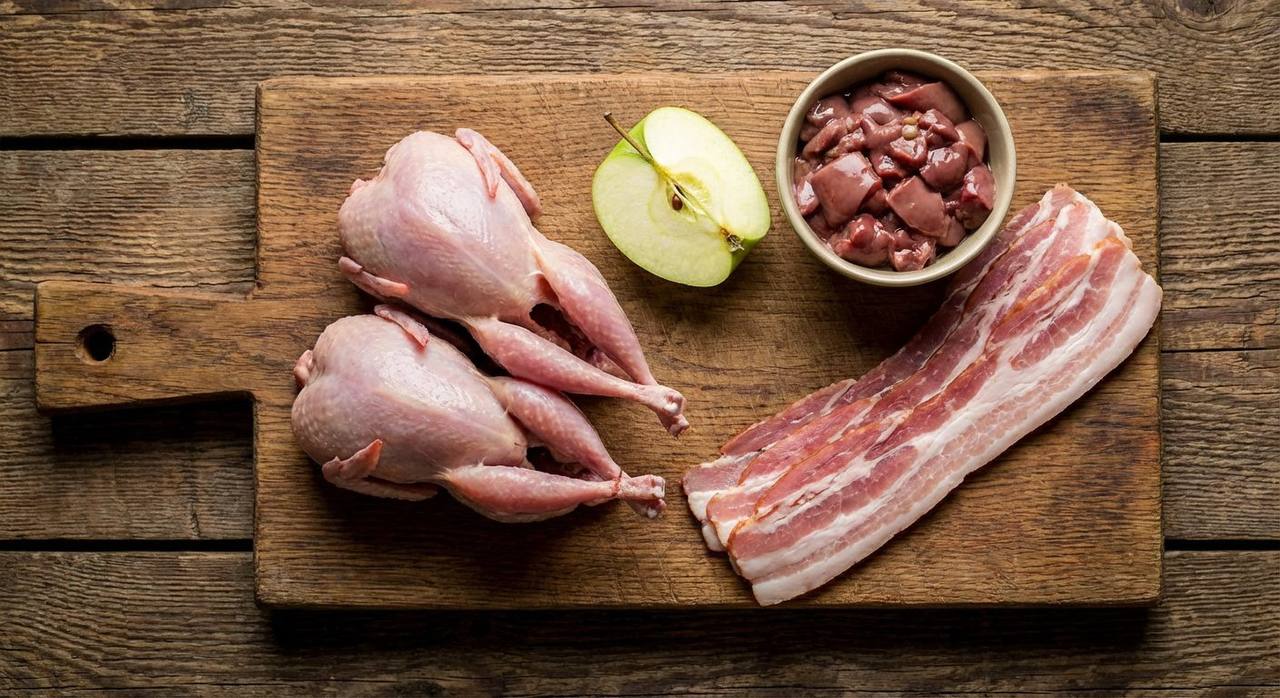 - Фаршируем перепелок полученной начинкой.Бекон выкладываем крестом и заворачиваем каждую перепелку.