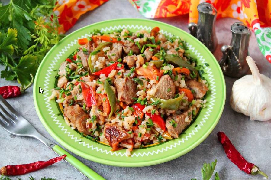 - Измельчите тонкие веточки петрушки с листочками. Добавьте в соте из индейки с рисом и перемешайте. Снимите с огня и разложите по порционным тарелкам.