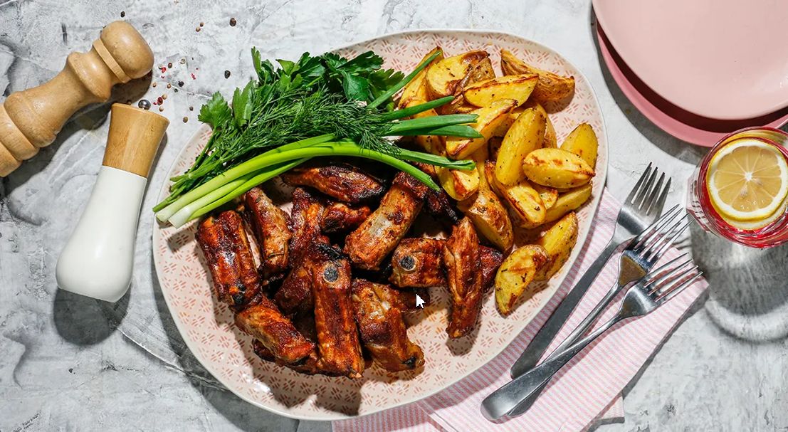 - Готовые свиные ребра в пиве подавайте к столу с отварным или жареным картофелем и обязательно – свежими овощами, зеленым луком, петрушкой, кинзой и укропом.
