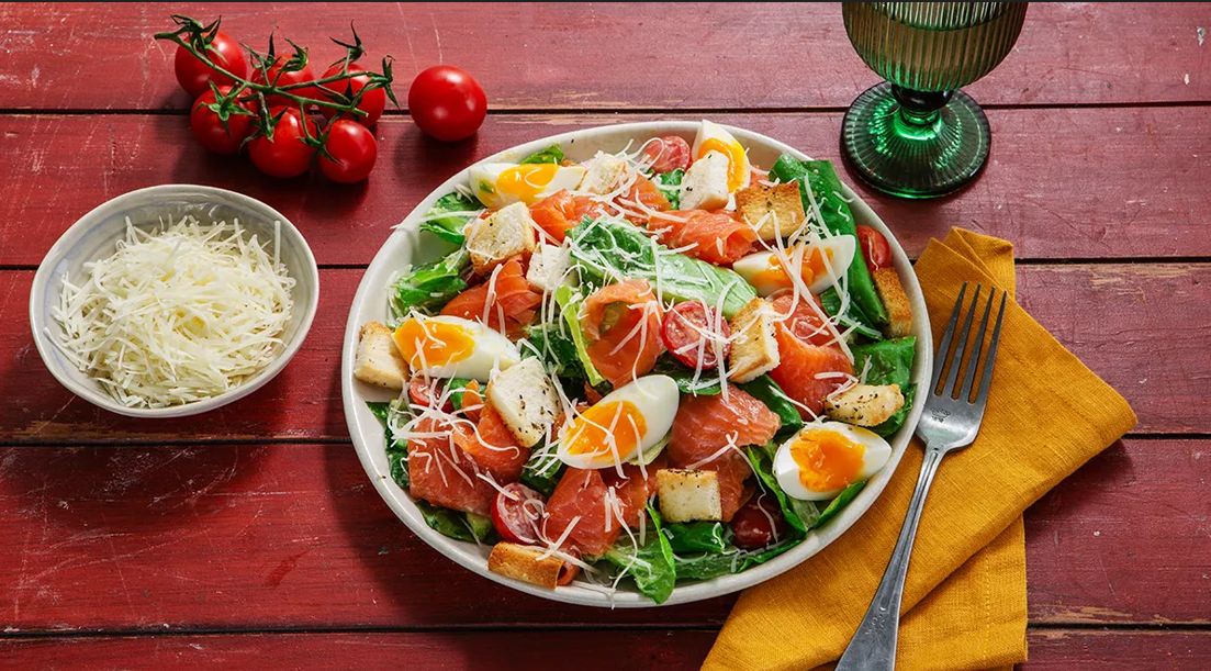 - Приготовьте заправку для салата «Цезарь» с соленой красной рыбой. Пропустите чеснок через пресс и смешайте его в стакане с майонезом, дижонской горчицей и лимонным соком. Работая погружным блендером, влейте тонкой струйкой оливковое масло. Затем добавьте тертый пармезан и снова взбейте. Приправьте по вкусу.